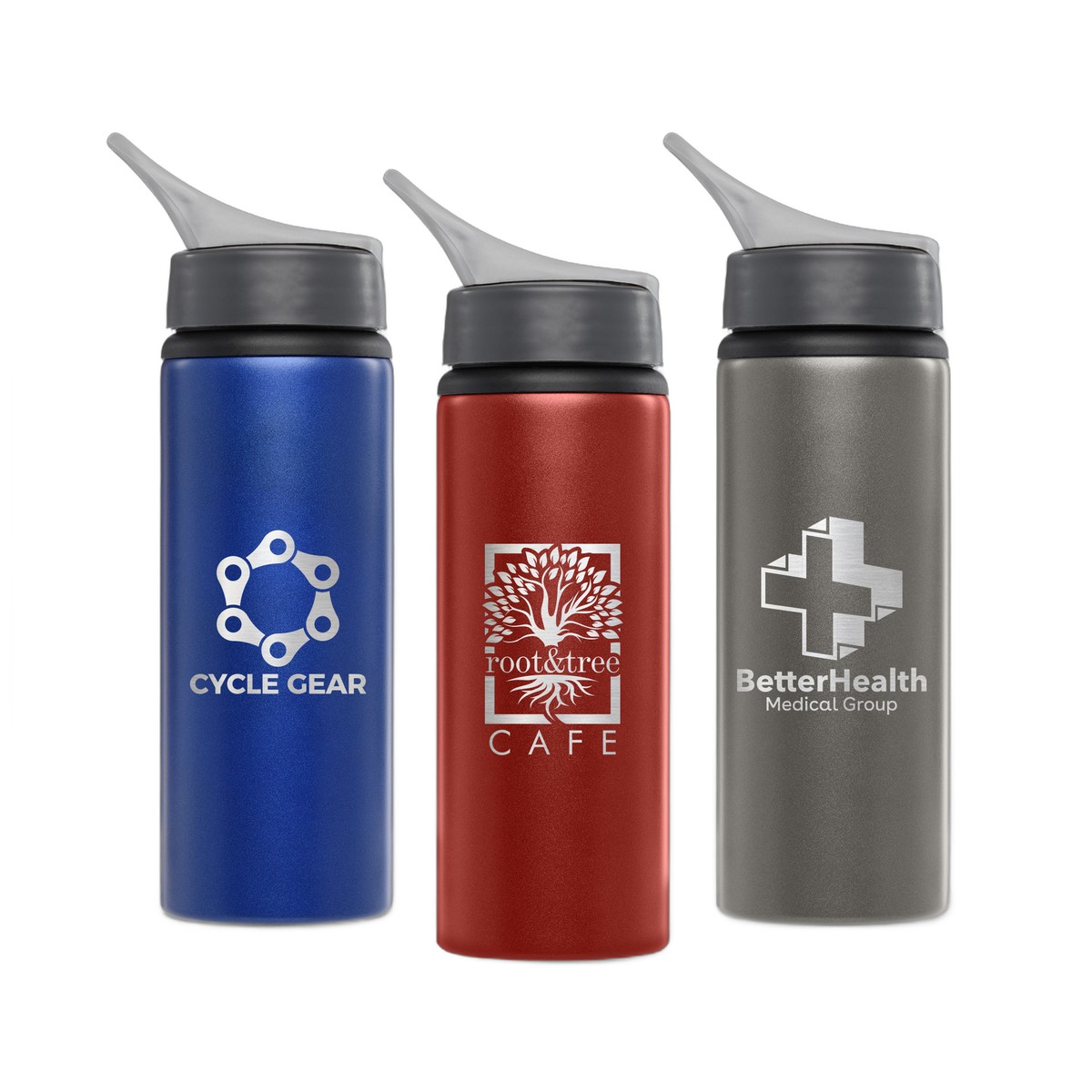 Now with precision Laser engraving that will make your logo shine, the Maui single-wall aluminum water bottle features an easy carry handle and spill-resistant screw-on lid. A flip-top sipping area and interior straw make for fast hydration on the go. This aluminum water bottle is made for cold beverages only. Available in a variety of colors featuring a satin finish. CA Prop 65 compliant. BPA free. Complies with CPSIA, FDA, Prop 65. 9.61" H x 2.88" W