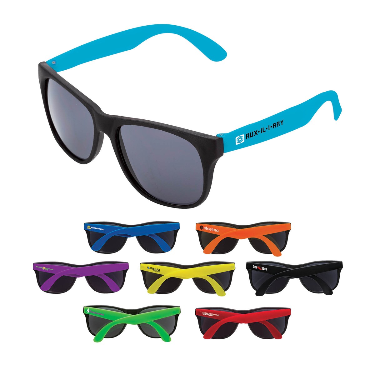 Two-tone matte finish fashion sunglasses feature tinted UV400 lenses providing 100% UVA and UVB protection. Complies with Prop 65. 5 1/2" W x 1 15/16" H x 1 3/4" D