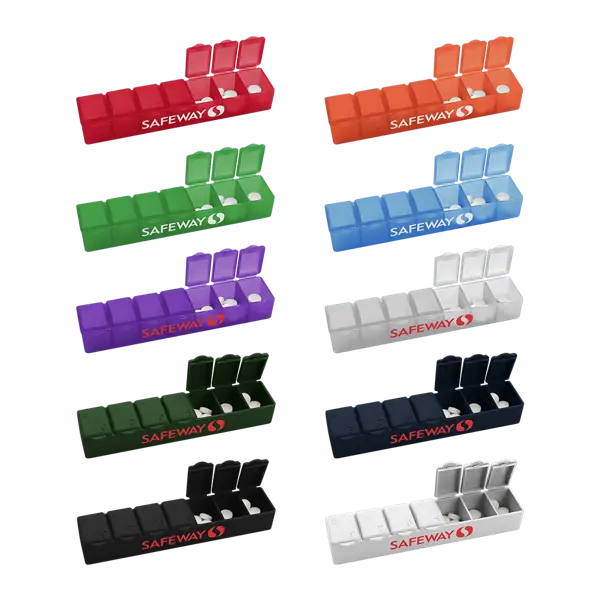 Stay organized and on schedule with the Medi-Box 7-Day Pillcase, a practical and thoughtful solution for daily medication management. Made in the USA, this reusable pill organizer features seven clearly marked compartments—each with raised lettering and Braille for enhanced accessibility. It's the perfect promotional item for pharmacies, hospitals, research labs, and assisted living facilities, helping clients and patients manage their health with ease. Add your company name or logo for a useful tradeshow giveaway that keeps your brand top of mind all week long. 1" W x 6.125" L x 1.25" H