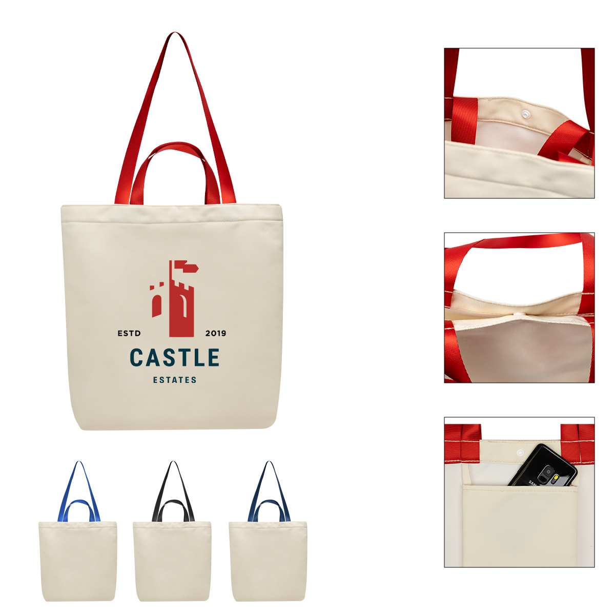 Made Of Combo: 600D Polyester With Shiny Webbing. Cotton Alternative With Cotton Feel. Large Open Main Compartment. 12" Handles. 4" D x 17.75" W x 14.75" H