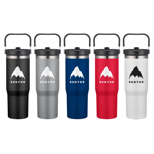 Big on capacity and built for convenience, the Memphis 30oz Top Handle Tumbler is your new go-to for drinks on the move. With a double-wall design featuring a stainless steel outer and a plastic inner, it keeps your favorite beverages at just the right temperature. The screw-on lid with a flip-up straw makes sipping smooth and simple, while the top handle makes carrying easy—whether you're heading to work, the gym, or an afternoon adventure. Finished with a durable powder coating, BPA-free, and perfectly sized to fit in most car cup holders, this tumbler is ready to tackle hydration in style. 10.36" H x 3.47" Diameter