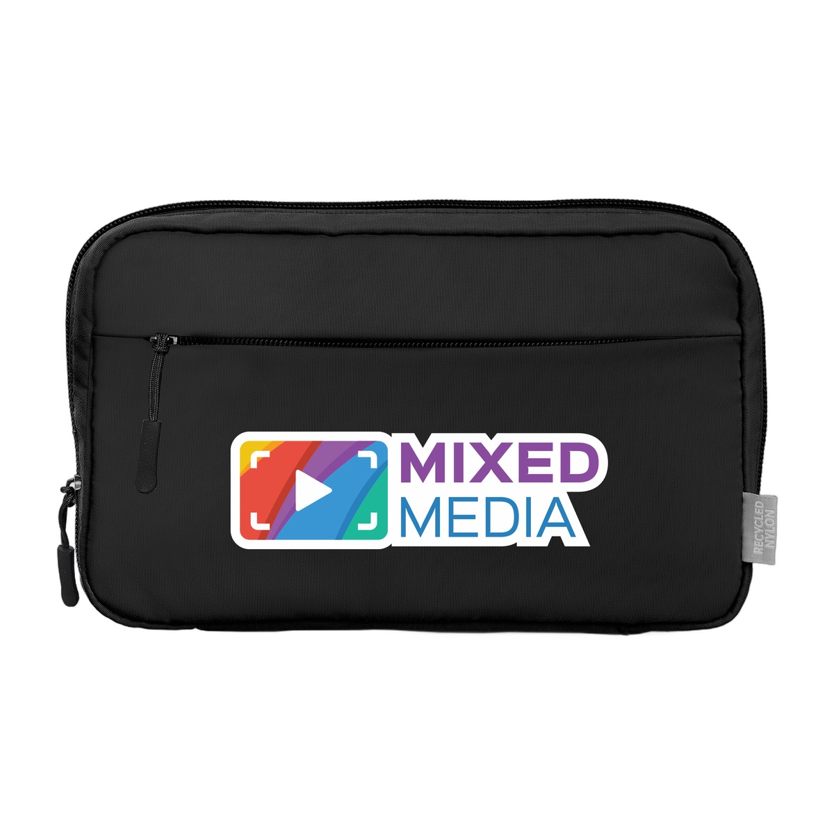 Keep life's essentials perfectly in sync with this Recycled Nylon Zipper Pocket Organizer Pouch. This isn't just a pouch; it's a sleek, durable solution for staying organized on the go, crafted from recycled 320D nylon with a 210D recycled polyester lining. Inside, discover intelligent design: a front zippered pocket, an internal zippered compartment, two mesh open pockets, and an elastic strap to secure cables and accessories. Every detail matters, from the top-quality zipper to the QR-coded Digital Product Passport and the exterior eco-tag. Compact yet surprisingly spacious, it's the ideal companion for organizing electronics, stationery, or travel essentials, bringing effortless order to any adventure. 5.71" H x 9.45" W x 1.77" D