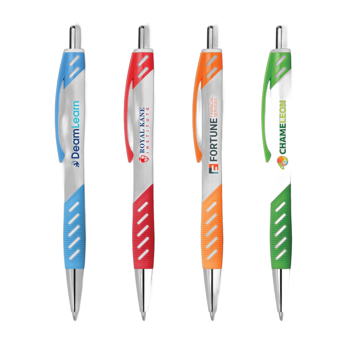 The Meteor Brights plastic ballpoint pen has a slightly contoured, smooth barrel, chrome accents, and a stylish cutout design on the colored rubberized grip that make this an eye-catching pen. Customize the white barrel by selecting a trim color and matching 1-color silkscreen imprint. Complies with Prop 65. 5.59" W x 0.39" D