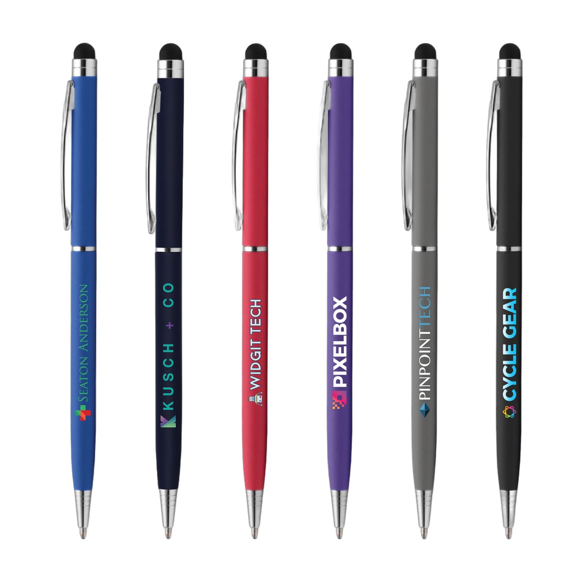 Sleek, soft and ultra slim, this twist-action ballpoint metal pen features the ever-popular rubberized soft-touch finish. Vibrant solid barrel colors, chrome accents and clip, the Minnelli Softy includes a stylus for use on touchscreen devices. Now available with ColorJet, our vibrant, Full-Color inkjet imprint. Complies with Prop 65. 5.41" H x 0.30" W x 0.30" D