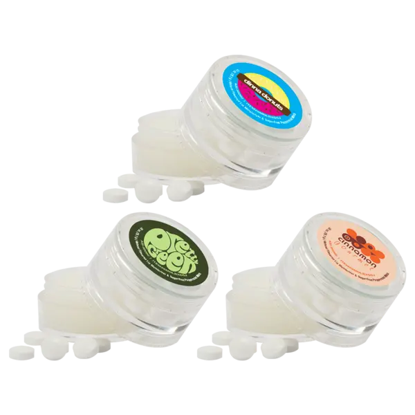 No need to swipe right to find the perfect match. It's right here. Our Double-Stacked Mint and Lip Moisturizer Jar is the perfect compact combo and just one cool new way you can market your biz. Next time you're attending a tradeshow, planning a fundraiser, or working at a big conference, try handing out these bad boys. The mints and balm are sugar and gluten-free. Complies with CPSIA, FDA, Food Grade, Prop 65. 1.5" H x 1.5" Diameter