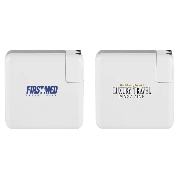Portable power on the go or at home! UL and ETL listed 6700 mAh Qi wireless charging powerbank/wall adaptor. Features interchangeable wall adaptors (only includes Type A); dual USB ports; type-C input; foldaway prongs; digital battery indicator light. Input: AC90-240V 50/60Hz 0.5a; output: 5V/2.4A; wireless charging output: 5W. 3.125" D x 1.125" H x 3.125" W