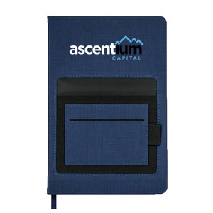 Perfect bound 80 cream sheet lined notebook with a tonal cross-hatched thermal PU cover and black satin bookmark. Features front elastic pocket to hold a cellphone and slot pocket for business cards. 8.25" H x 5.5" W