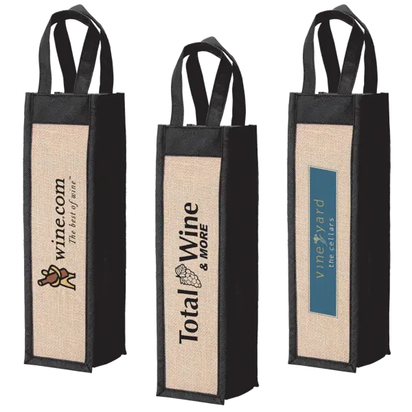 Laminated natural jute panels with structured bold color polypropylene nonwoven material gift tote, Matching color handles and nonwoven covered base board for reinforcement. Heat transfer only.