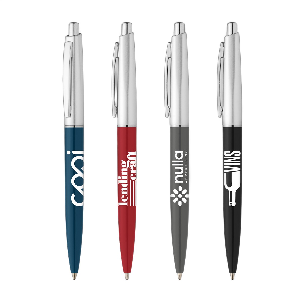 Meet the Natori Chrome Trim Pen, a modern interpretation of a classic style. This retractable pen's barrel is made from recycled plastic (rABS), featuring a molded color finish on the lower barrel and a contrasting chrome upper barrel, clip, and tip. The design offers an "old school" style with updated materials. The Natori pen is equipped with a high-quality Parker refill that delivers smooth black ink through a 1.0mm tip and boasts an impressive 800-meter write out length. Available in colors like red, navy, and grey, this pen combines a timeless look with reliable, long-lasting performance. 5.71" W x 0.39" D