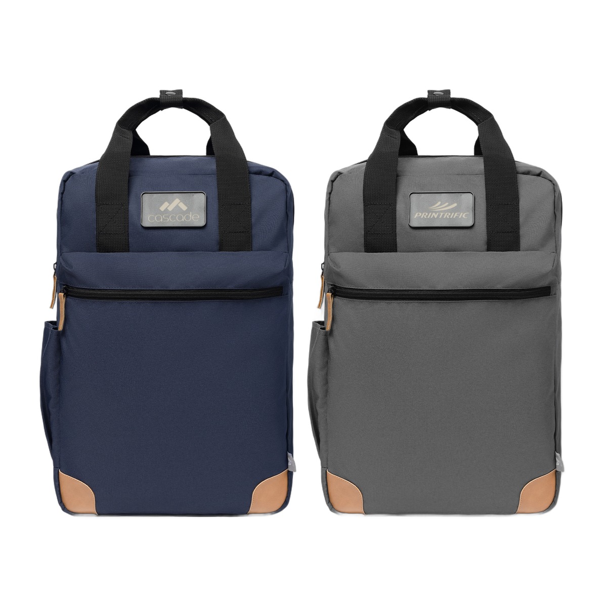 A next-level backpack is here. Our Navigator Backpack has a main zippered compartment with a padded laptop sleeve. The front zipper and side slash pockets create even more storage when needed. The padded adjustable straps, elastic trolley strap on the back side, and two handles on the top of black webbing make carrying 13 L with a max weight of 17 lbs easier. The backdrop of modern colors and tan accents make brand messages look even more sophisticated and high-value. Fits common laptop sizes including 13'', 14'', 15'', 16'' and 17''. Complies with Prop 65. 16.93" H x 11.81" W x 4.72" D