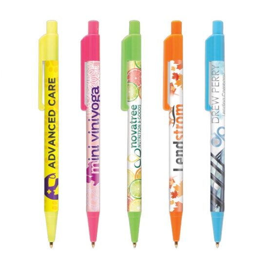 Stand out from the crowd at any trade show or marketing event with the Neon Colorama! One of the industry's most popular pens, it's trimmed in your choice of five bright neon trim colors. This plastic pen features our SimpliColor (TM) printing process, giving you one of the largest one to four color process imprints for your company name, logo and advertising message. Our gel-like Eversmooth (R) hybrid ink gives you an extraordinary writing experience in black and blue ink choices.