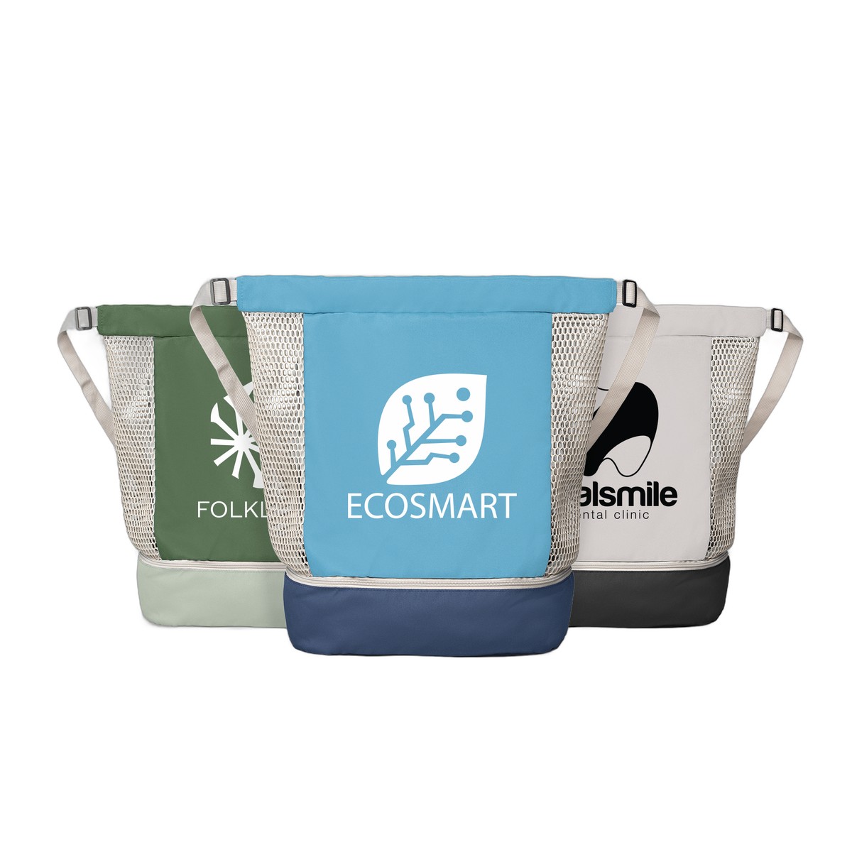 Our Neri is a versatile and innovative bag perfect for sports, travel, and daily use. This 34-liter drawstring bag is made from durable 300D 100% post-consumer recycled polyester with PU backing, featuring breathable mesh panels on both sides. The key feature is the zippered compartment at the bottom, which creates a separate storage area ideal for keeping gym shoes, wet clothes, or travel items organized and separated from the main contents. The bag's soft, light construction and modern design make it a great mid-range option that combines practical functionality with conscious materials. 17.32" H x 18.11" W x 6.69" D