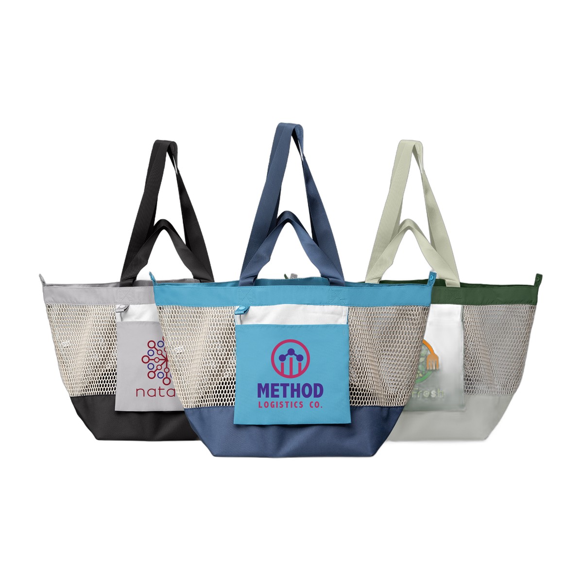 This Neri Tote is an innovative, multi-purpose bag that combines trend-driven design with ultimate practicality. This spacious 45-liter tote is crafted from durable 300D recycled content polyester with a striking mesh main body and solid color block panels. The foldable functionality is a key feature: the bag neatly stores into its own front pocket, keeping your logo visible whether the bag is open or folded. It offers versatile carrying with dual handles (short and long). Perfect for grocery shopping, daily errands, or as a beach bag, the Neri's large-capacity, foldable design makes it an ideal reusable bag for any need. 12.20" H x 22.83" W x 11.42" D
