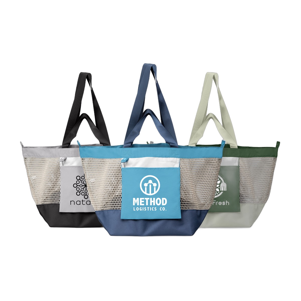 This Neri Tote is an innovative, multi-purpose bag that combines trend-driven design with ultimate practicality. This spacious 45-liter tote is crafted from durable 300D recycled content polyester with a striking mesh main body and solid color block panels. The foldable functionality is a key feature: the bag neatly stores into its own front pocket, keeping your logo visible whether the bag is open or folded. It offers versatile carrying with dual handles (short and long). Perfect for grocery shopping, daily errands, or as a beach bag, the Neri's large-capacity, foldable design makes it an ideal reusable bag for any need. 12.20" H x 22.83" W x 11.42" D