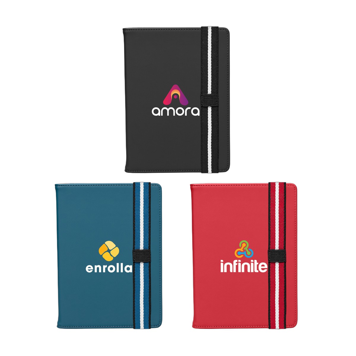 The Newport Refillable Journal is a complete, sophisticated package for taking notes. The cover is made from PU that has at least 50% post-consumer recycled content with a luxurious suede interior lining. Its distinctive feature is the chevron weave strip sewn onto the elastic closure, providing a stylish accent and keeping the journal securely closed. Functionality is key: the inner structure is refillable, and the cover features a document pocket on the left side and a pen loop conveniently placed in the center. Included is an A5 notebook with 80 sheets of 70gsm FSC®-certified lined paper, ensuring this journal is as practical for long-term use as it is stylish. 8.54" H x 6.14" W