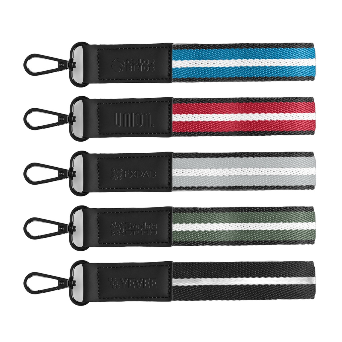 The meticulously crafted Newport Keychain Wrist Strap is a stylish and practical accessory for securing essentials. This wrist strap keychain features a durable 100% post consumer recycled polyester (rPET) woven strap with a distinctive chevron design and black edging. The strap is secured by a sturdy, black steel Snap Trigger carabiner that swivels on a D-ring, making it perfect for attaching keys, ID badges, or small accessories. The high-quality construction allows the snap trigger to hold a maximum weight of 10 kgs, combining alternative materials with reliable performance. 1.00" H x 9.13" W