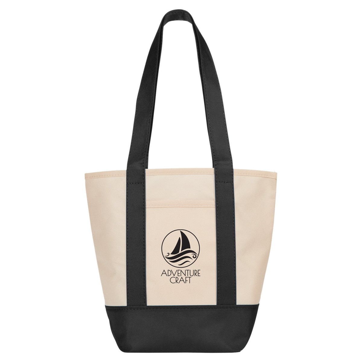 Reusable mini tote bag made of 80 GSM Non-Woven Polypropylene. Classic two-tone design. Perfect size for snacks, small items, or on-the-go essentials. Front slash pocket for easy access to your must-haves. Recommended weight tolerance: 8.5 lbs. 13.0000" W x 11.0000" H x 6.0000" D