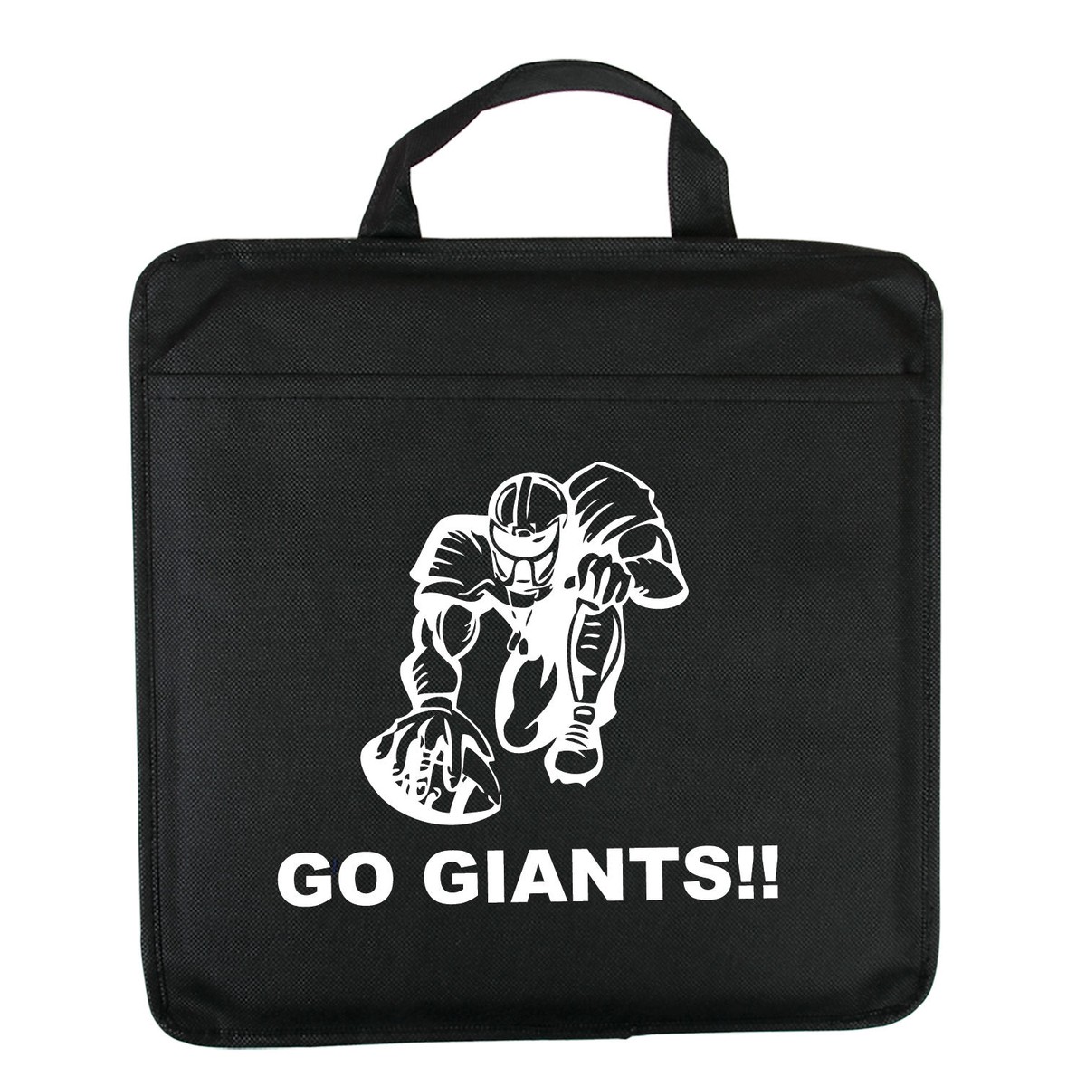 Reusable stadium cushion with front pocket and reinforced 9.4"l carry-handle. Made of water resistant 80 GSM Non-Woven Polypropylene. Features foam padding for comfort. Available in a range of team and school colors. 12.0000" W x 12.0000" H x 0.3300" D