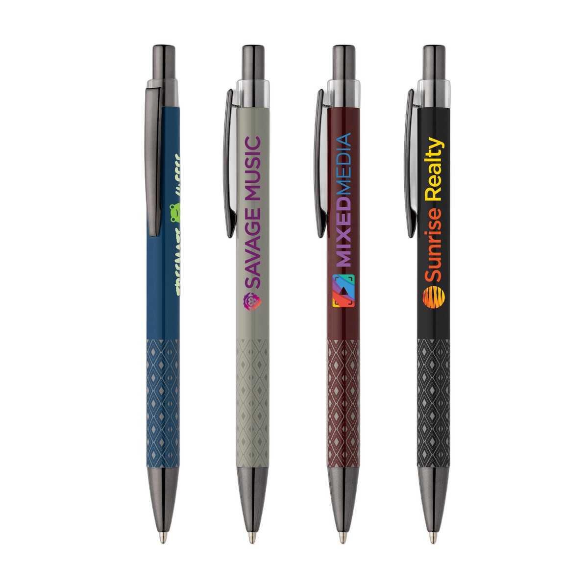 Meet a modern writing tool that beautifully balances alternative materials and sophisticated design. This retractable pen features a sleek, anodized barrel crafted from recycled aluminum. A subtle tonal pattern is printed on the grip area for enhanced feel and style. The pen boasts a high-end look with dark shiny gunmetal finishes on the tip, plunger, and the steel clip, which contrasts beautifully with the colored barrel. Equipped with a slim German Dokumental ink refill, this pen delivers smooth black ink through a 1.0mm tip and provides a reliable 500-meter write out length, making it a stylish and dependable choice for daily use. 5.56" W x 0.39" D