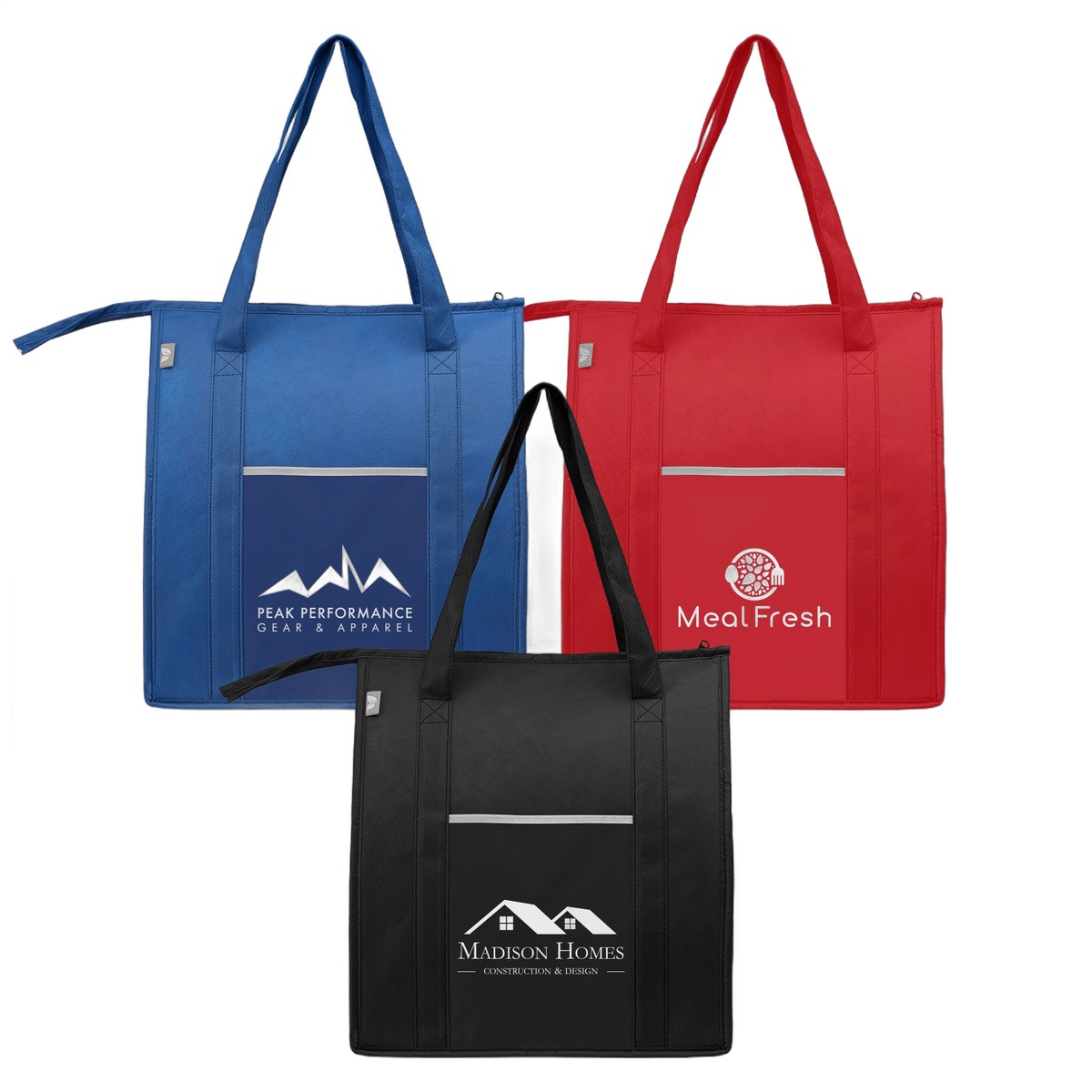 Introducing our North Park RPET Cooler Bag – a functional choice for keeping things cool on the go. The exterior is made from 100% RPET 2oz. Non-Woven material, while the interior features EPE Foam Aluminum foil for effective insulation. The cooler has one main compartment with a zipper closure, and a front pocket for added convenience. Measuring 12.99" × 14.96" × 10.04", with handles sized 1.18" × 4.72", it has a generous 25 L capacity, and supports a maximum weight of 22 lbs. Additionally, the eco tag, made of Jacquard material, is sewn on the outside down the right side of the bag, featuring a leaf design on one side and proudly stating "recycled PET" on the other. Your logo will be imprinted in Silkscreen. Complies with Prop 65. 14.96" H x 12.99" W x 10.04" D