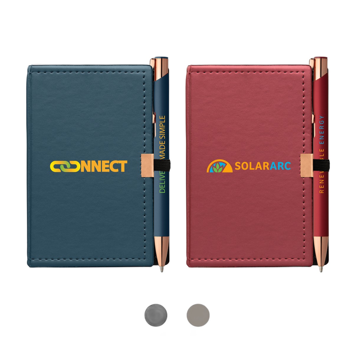 Our Note Caddy & Crosby Rose Gold Pen Gift Set is a fun gift for customers, employees, students, and event participants. The note caddy holds a 3 x 5" note pad, 2 colors of sticky notes, 5 colors of sticky flags, and our customer-favorite Crosby Softy Pen with rose gold trim. Our ColorJet technology will imprint your full-color logo on both the caddy cover and on the pen for twice the branding impact. Complies with Prop 65. 5.19" H x 3.13" W x 0.56" D