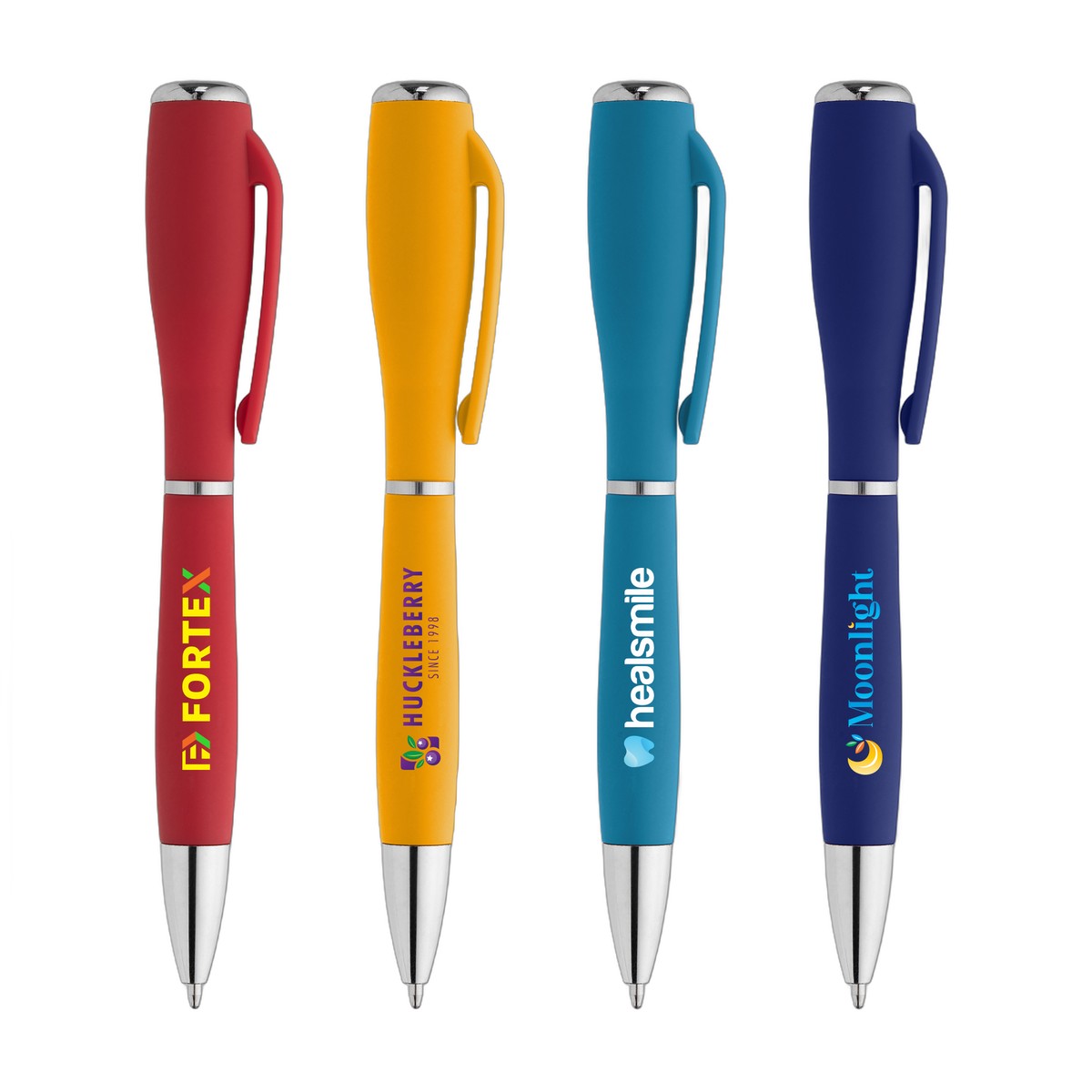 A unique pen that's sure to make an impression, the Nova Softy Brights has a modern, rubberized soft touch finish, a substantial barrel, and a contoured shape for optimal writing comfort. This pen also serves as a flashlight, making it a functional promo item customers will appreciate. Select from a variety of bright barrel colors to . A bright, memorable promo item for tradeshows and more. Complies with Prop 65. 5.10" W x 0.75" D