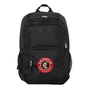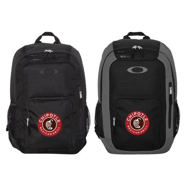 Sleek 600D backpack with padded laptop sleeve, fleece-lined eyewear/media pocket, interior organizer panel, and mesh water bottle pockets. Padded adjustable shoulder straps. 22L capacity. Mill#921055ODM. 5.5" D x 19" H x 12.5" W