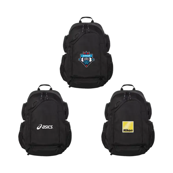 Sturdy 600D backpack with polyester lining. Features padded laptop sleeve, internal organizer panel, vertical-zip stash pocket, mesh water bottle pockets, and multiple zippered pockets. Includes fleece-lined eyewear/media pocket and padded adjustable shoulder straps. 32L capacity. Fits most 15" laptops. 20" H x 13.5" W