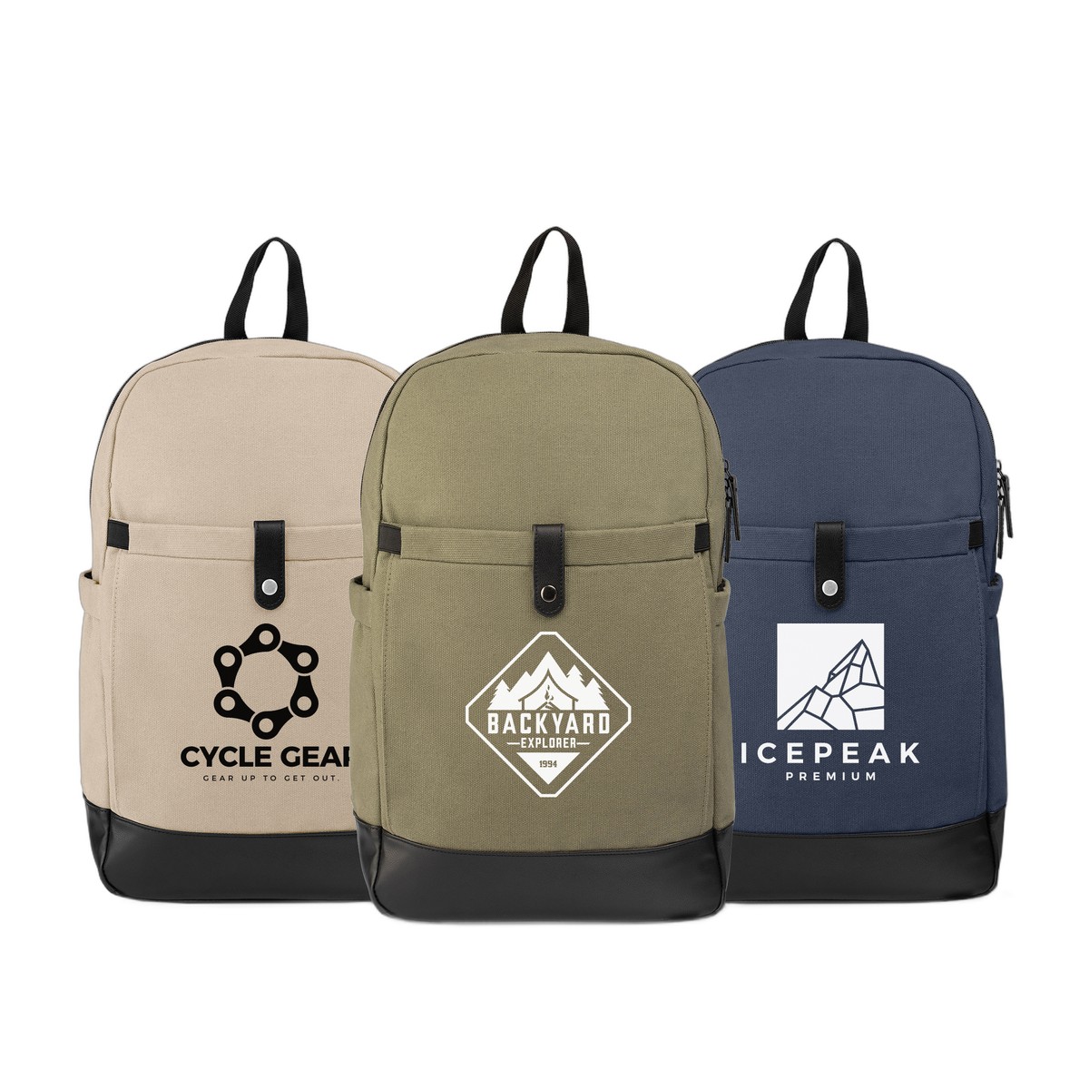 Introducing the Odyssey Pack, a versatile backpack for everyday use. Made from recycled cotton canvas with a black recycled PU bottom. It features an open front pocket, a large main compartment, and a padded sleeve for a range of laptops including 13", 14", 15", 16" and 17". It weighs 505 grams; capacity 12 L (max weight 5 kg). Padded shoulder straps and conscious labels are included. Complies with Prop 65. 17.72" H x 11.02" W x 4.33" D