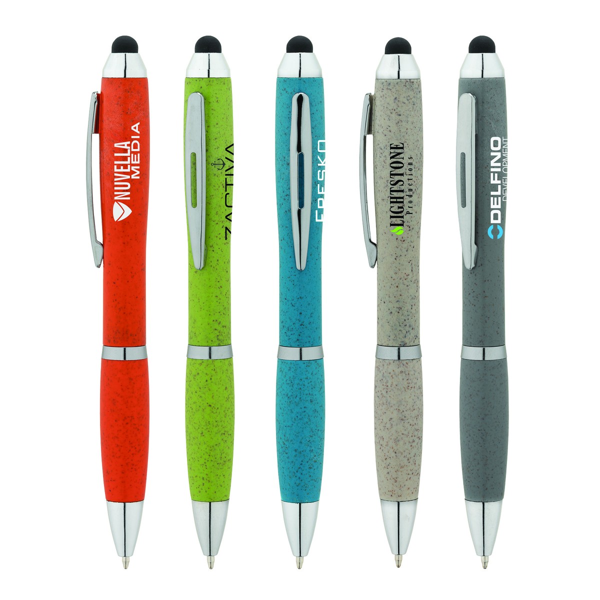 The Olivia Twist-Action Plastic Ballpoint Pen is made from a 50/50 blend of renewable wheat straw, which is the stalk left over after the harvest of wheat grains and ABS plastic. It has chrome trims, a metal clip and a capacitive stylus for touch screen devices. This pen makes a great eco-conscious gift and writes in black ink. Complies with Prop 65. 5/8" W x 5 5/16" H x 1/2" D