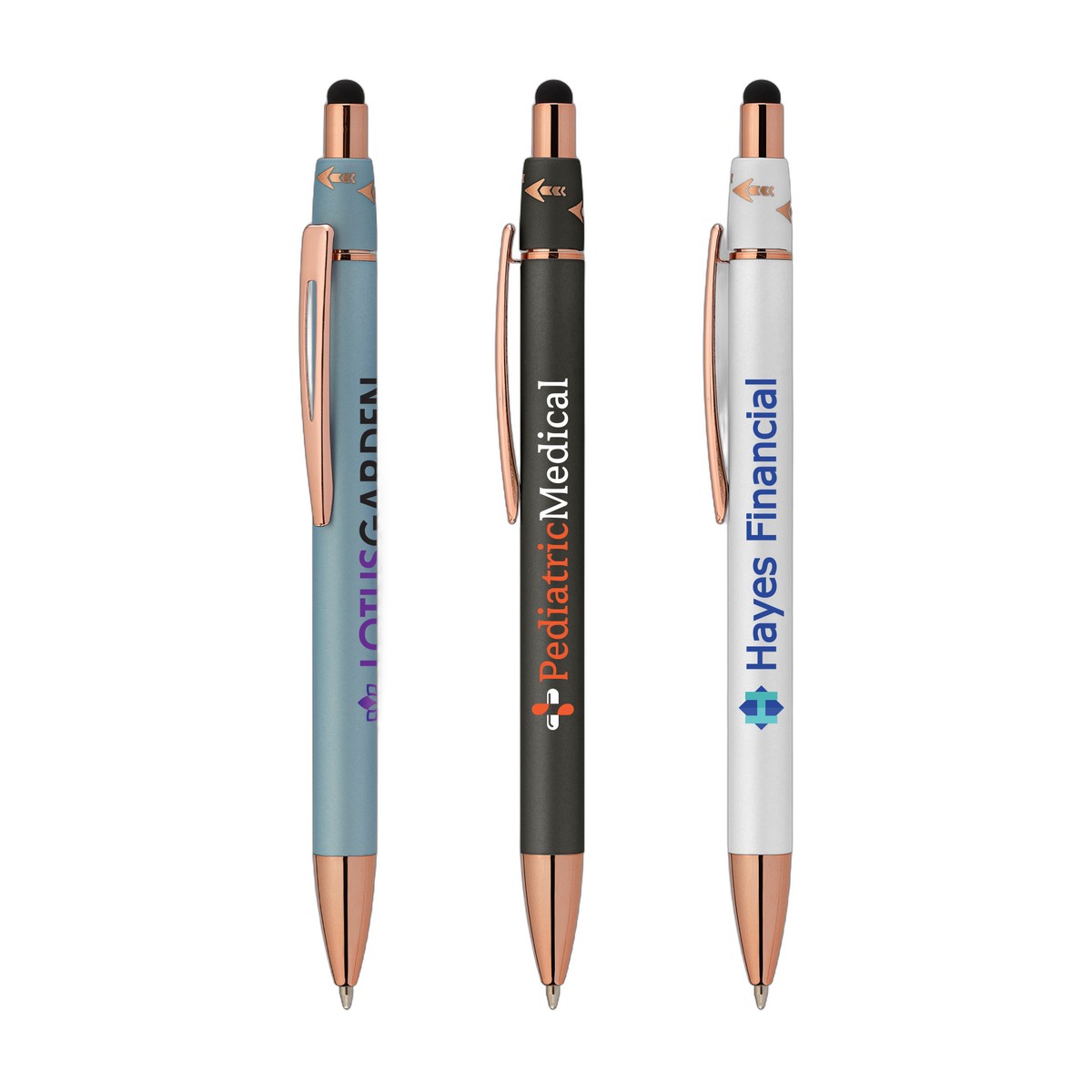 Introducing our new Orbit Spinner Metal Pen with Stylus, a perfect blend of tradition and innovation. With a retractable aluminum barrel and a rotating fixture adorned with rose gold arrows activated by a simple thumb push, it offers a unique writing experience. The luxurious rubber paint finish and rose gold trim add elegance. Seamlessly transition between paper and digital interfaces with the black stylus. The spinning portion, adorned with rose gold arrows, enhances both visual appeal and tactile experience. Your logo will be imprinted in Laser Engraving. Complies with Prop 65. 5.87" W x 0.41" D