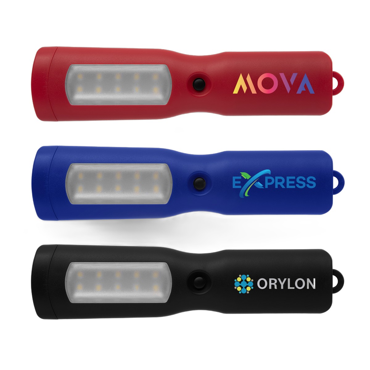 The Orion flashlight features 13 powerful LED light elements to brighten the night. There are 3 forward-facing LED bulbs, plus an array of 10 SMD LED elements to provide a super-bright light, great as a work light, for hiking, camping, and so much more. Includes 3 AAA batteries and can be easily replaced. Customize it with your full-color logo, using our ColorJet imprint technology. Complies with Prop 65. 6.89" H x 1.64" W x 0.69" D