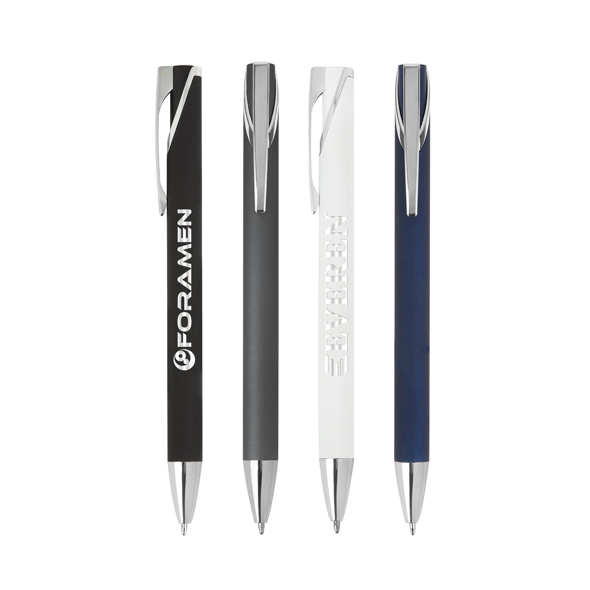 The Paradigm Push-Action Retractable Ballpoint Pen is engineered for effortless functionality and sleek style. Crafted with a durable aluminum body and finished with a smooth rubberized texture, this pen is designed to make writing a pleasure. Equipped with a convenient pocket clip and adorned with chrome trims, it seamlessly blends practicality with sophistication. With reliable black ink, the Paradigm Pen is the perfect companion for your daily writing needs. Complies with Prop 65. 9/16" W x 5 5/8" H x 7/16" D