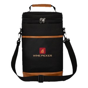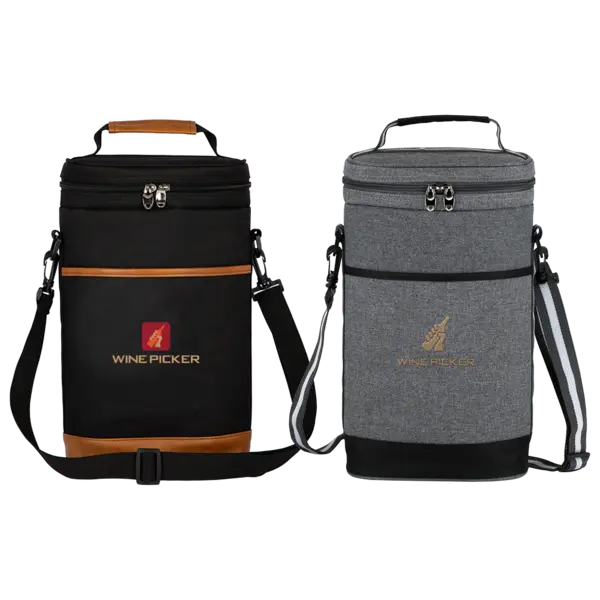 Heathered 600D poly canvas/600D polyester wine cooler bag with 6mm PE foam padding and gray PEVA lining. Two wine bottle capacity, 5lb capacity; top zip main compartment with attached lid; open front pocket; adjustable shoulder strap (23"-44 ½") with white stripe detailing; top grab handle. 8.25" L x 4.75" W x 14" H