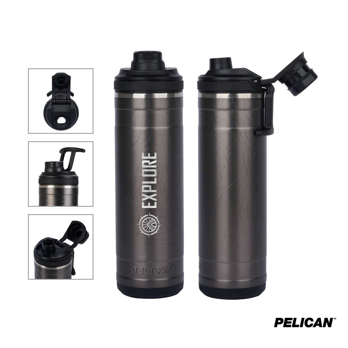 Elevate your everyday hydration with the 26 oz. Pelican Pacific Chug Water Bottlecrafted for performance, convenience, and a modern, rugged aesthetic. Built from 90% recycled 18/8 stainless steel, its double-wall vacuum insulation and copper lining help keep drinks ice-cold for up to 24 hours. The functional chug spout and screw-top lid with a tethered cap make it easy to drink quickly without removing the entire lid. Designed for life on the move, it features a T-bar swing handle for effortless carrying or attaching to a bag. A removable silicone base cushions the bottle against drops and hard surfaces while enhancing grip. Finished in a metallic gunmetal color with an embossed 3D topographical design, this bottle combines durability with bold style. It fits most car cup holders and is both BPA-free and FDA compliant. Complies with Prop 65. 3 1/4" W x 11" H x 3 1/2" D