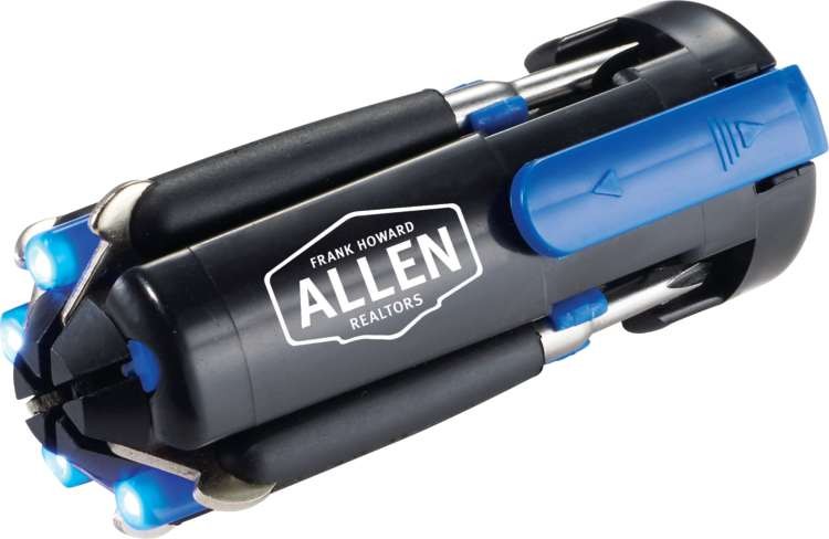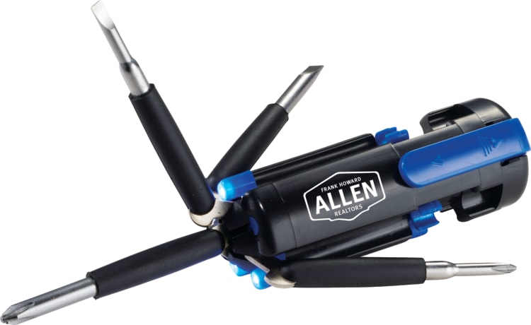 The Bullet Penta 6-in-1 Screwdriver Flashlight is a convenient, foldable screwdriver tool with a combination of hex star head flat and Philips styles of screwdriver bits. It also features a four-white LED flashlight with an on/off power switch on the back. 3.54" D x 1.18" W x 1.38" H