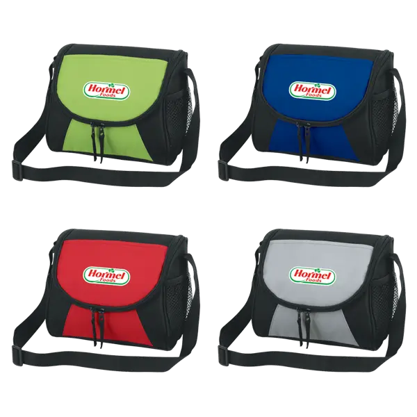 600D Polycanvas bag with dual zippered insulated main compartment, Additional outside pocket, Mesh side catch pockets, Adjustable Black comfort shoulder strap, Bold colors with Black accents.