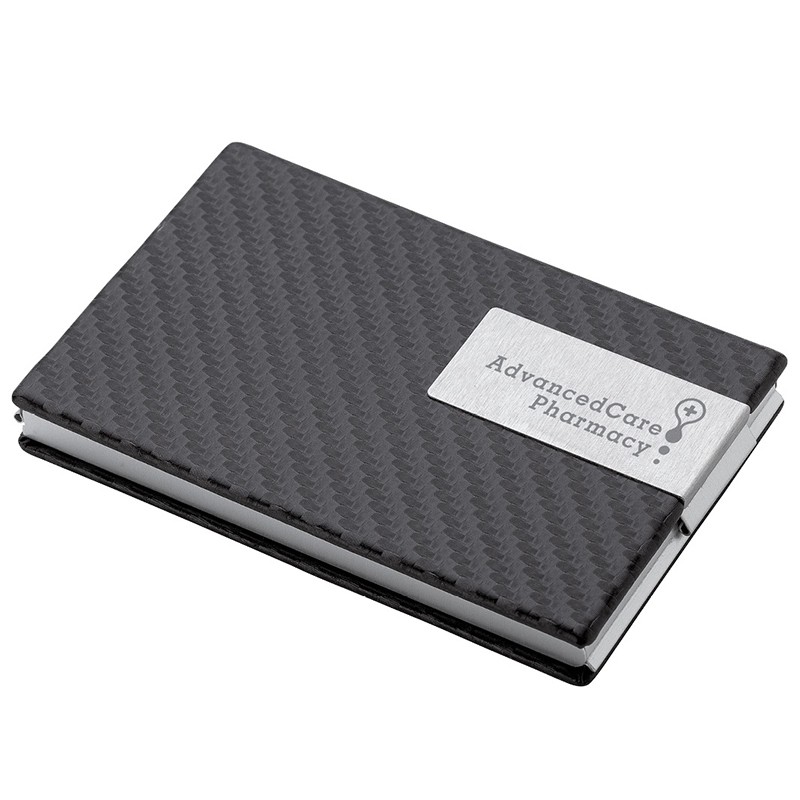 Business card case has a carbon fiber pattern, engraving plate, protective metal card storage and snap closure. Complies with Prop 65. 3 13/16" W x 2 1/2" H x 1/2" D