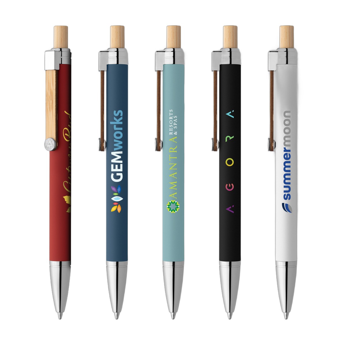 The Phoenix Recycled Aluminum Softy Pen features a recycled aluminum barrel with a rubber-painted finish for a smooth, comfortable grip. The chromed silver tip and top, crafted from RABS plastic, are complemented by bamboo accents on the plunger and clip. A chromed disc with a molded recycled symbol sits at the end of the clip, enhancing the design. Equipped with a slim 1.0mm Dokumental Ink refill, it offers an 800m write-out for a smooth, consistent writing experience. Complies with Prop 65. 5.59" W x 0.42" D