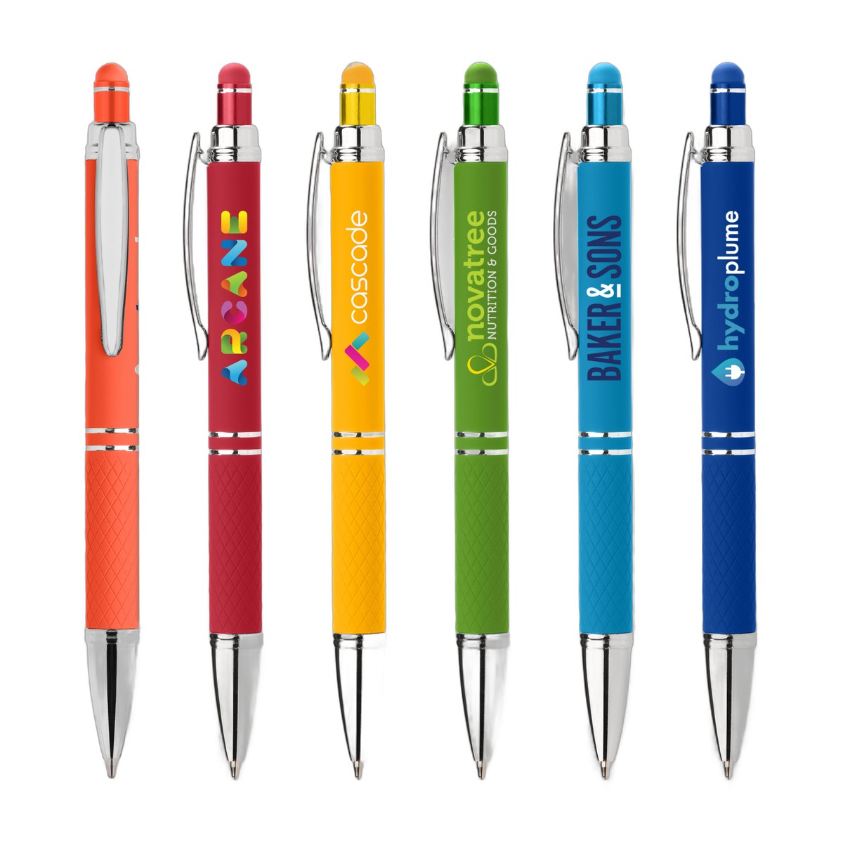 Now with super-smooth gel writing ink, the Phoenix Softy Brights Gel features our luxurious soft-touch rubberized finish, which also coats the diamond-textured grip. Polished chrome accents, trim and clip create a sophisticated look. Choose from a variety of vibrant barrel, grip and matching stylus colors. . Complies with Prop 65. 5.64" W x 0.42" D