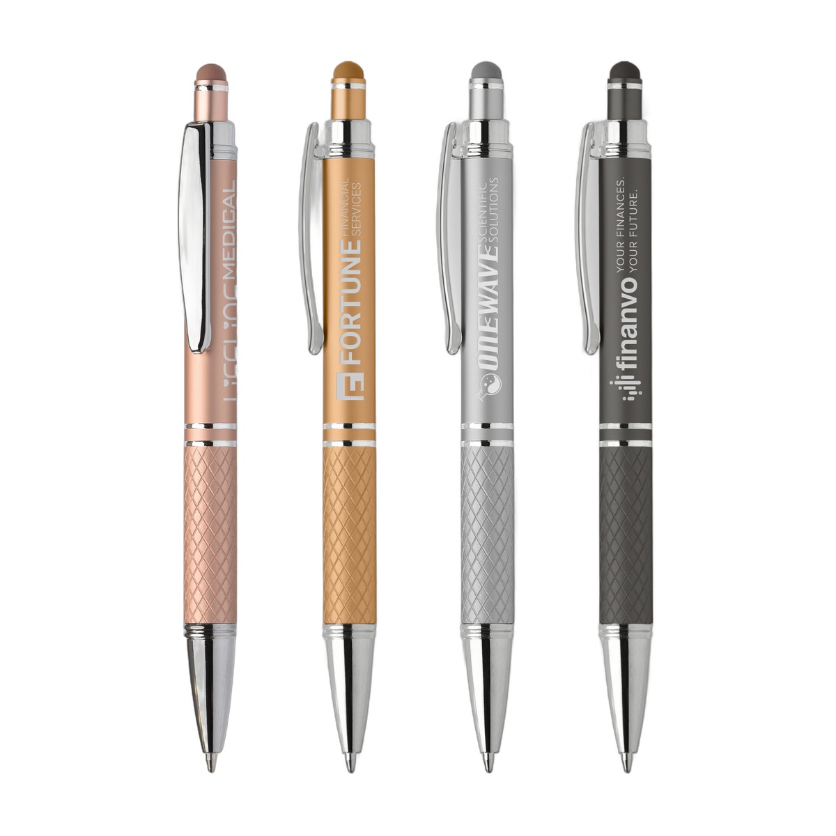 The Phoenix Softy Metallic features luxurious soft-touch finish in rich, metallic colors on the barrel and on the diamond-textured grip. Polished chrome accents, trim and clip create a sophisticated look. Choose from a variety of premium barrel and matching stylus colors. . Complies with Prop 65. 5.47" W x 0.42" D