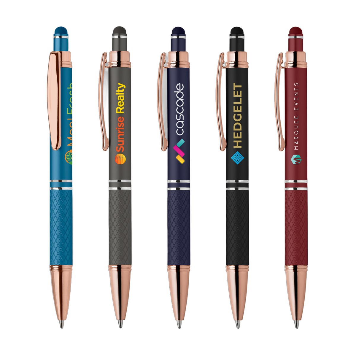 The Phoenix Softy Rose Gold Classic Pen features luxurious soft-touch finish in classic colors on the barrel and on the diamond-textured grip. Stylish rose gold accents, trim and clip create a fashionable look. Choose from a variety of premium barrel and matching stylus colors. . Complies with Prop 65. 5.64" W x 0.42" D