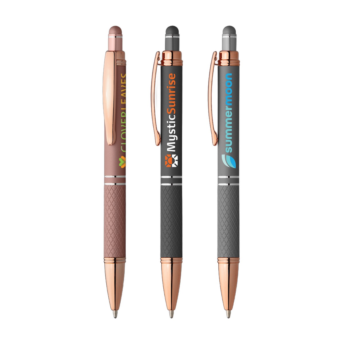 Introducing the Phoenix Softy Rose Gold Gel Pen w/Stylus - This pen showcases the latest trend in mineral hues, complemented by rose gold accents. Crafted with an Aluminum Barrel featuring a knurled grip and a satin rubber finish. This retractable stylus pen exudes luxury, while the stylus color perfectly matches the pen barrel. Your custom logo will be laser imprinted in silver. Complies with Prop 65. 5.64" W x 0.42" D