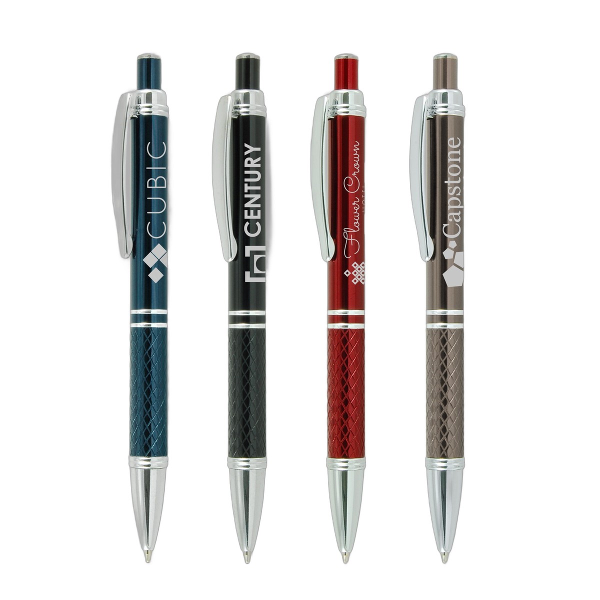 Rise above all of your competitors when you add this Phoenix Pen to your new advertising campaign! The modern click action pen features a textured grip so that your clients won't tire of holding your brand in their hands. The polished chrome accents add an executive look that they'll love to show off at the office after returning from your event. Customize it using our crisp laser engraving. Use this as a tool for connecting to customers at trade shows, seminars, conventions and more! Complies with Prop 65. 5.46" W x 0.59" D