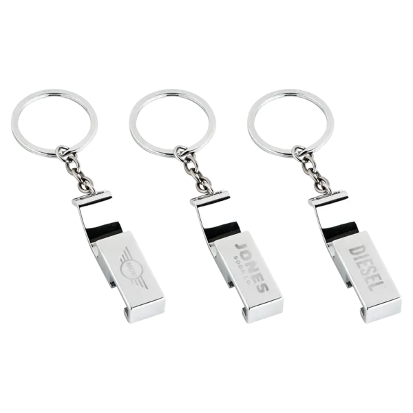 Chrome finish metal bottle opener and phone stand keychain. 4.5" D x 0.6" W