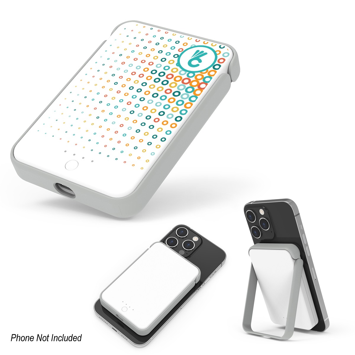 MagSafe® Compatible Wireless Charger That Magnetically Connects To The Back Of Your Phone Or MagSafe® Case. Output: 10W. 5,000 mAh Lithium Ion Battery Included. Perfect For On-The-Go Charging. 2.75" W x 4" H