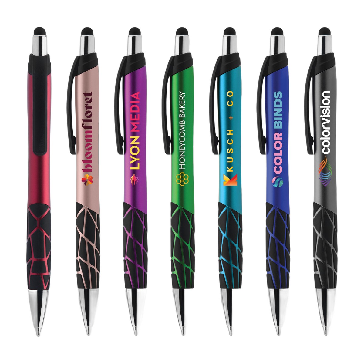 The Quake Stylus is a plastic ballpoint pen with the look and feel of metal. This pen features vibrant barrel colors with a metallic finish, chrome and black accents, and a stylus for use on touchscreen devices. The Quake Stylus pen has a uniquely textured grip in a shattered pattern. . Complies with Prop 65. 5.49" W x 0.44" D