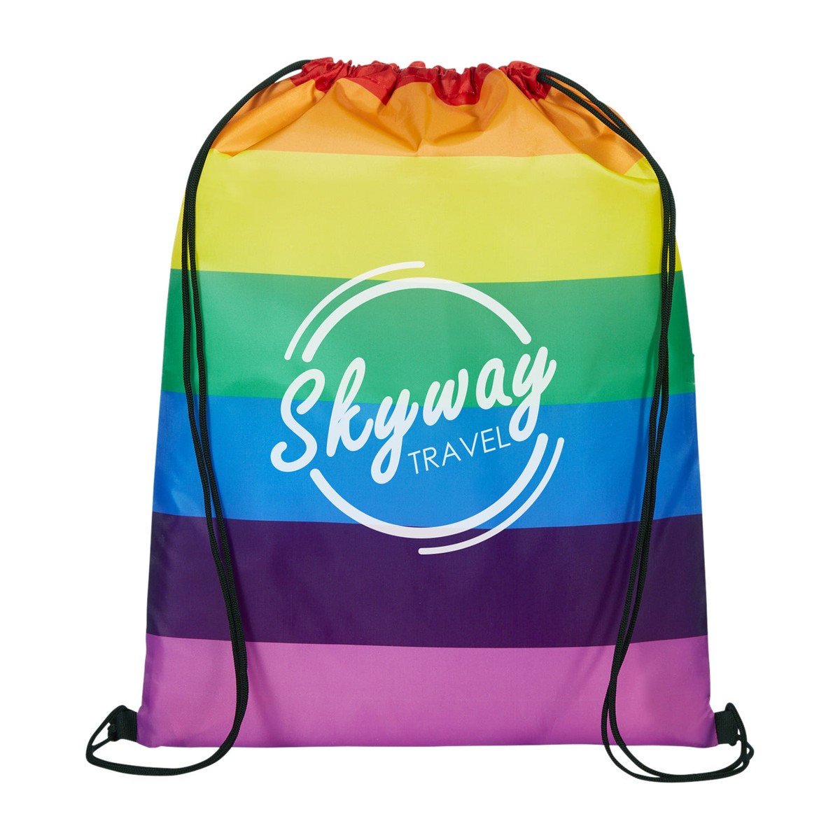 This vibrant 210D Polyester drawstring bag features a bold Pride rainbow design to carry for festivals, parades, or everyday celebrations. Black PP shoulder strap doubles as a drawstring closure. Recommended weight tolerance: 6.5 lbs. 14.0000" W x 18.0000" H