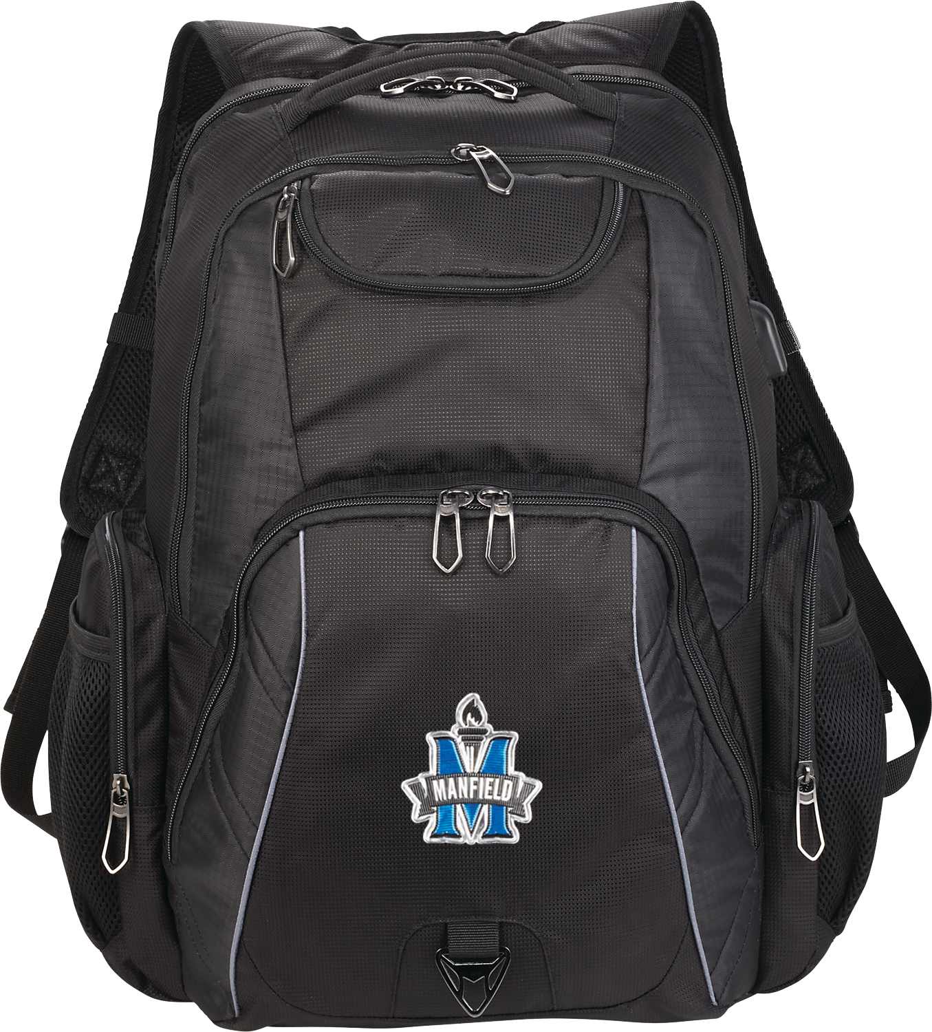 The Rainier TSA 17'' Computer Backpack has a large zippered main compartment with a built-in USB port and cable, enabling seamless charging capabilities directly inside of the backpack. Its TSA-approved 17'' computer compartment unfolds to lay flat on the X-ray belt.. The backpack is loaded with convenient features to simplify travel, including a deluxe organizational panel, an easy-access top pocket compartment, and two zippered side pockets with mesh water bottle pockets. The Rainier 17'' Computer Backpack also comes with custom zipper pullers, a padded back panel, a comfortable chest strap, and a trolley sleeve for easy handling. 7.50" D x 13.25" W x 19.00" H