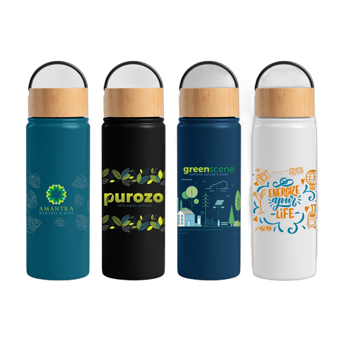 Introducing the Reborn - 18 oz. Double Wall Stainless Steel Bottle. This sleek and functional bottle features double-wall vacuum insulation, keeping your hot drinks warm for up to 12 hours and your cold drinks chilled for up to 24 hours. The exterior is crafted from 304 recycled stainless steel with a matte finish, while the interior is also made of 304 recycled stainless steel for optimal temperature retention. The bamboo lid adds a touch of natural elegance, complemented by a handle with a gunmetal finish. With a capacity of 18 oz, this bottle is perfect for all your beverage needs. Please note, it is not suitable for dishwashers or microwaves. Ideal for everyday use, whether you're at home, at the office, or on the go. Complies with Prop 65. 8.66" H x 2.95" W